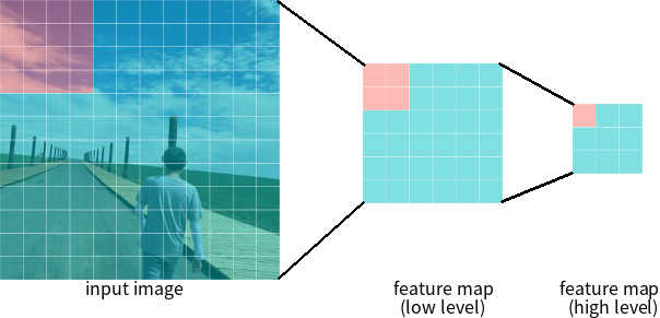 Finally, we turn to FPN. As mentioned, FPN is built in a fully convolutional fashion which can take an image of an arbitrary size and output proportionally sized feature maps at multiple levels. Higher level feature maps contain grid cells that cover larger regions of the image and is therefore more suitable for detecting larger objects; on the contrary, grid cells from lower level feature maps are better at detecting smaller objects (see Figure 6 4). With the help of the top-down pathway and lateral connections, which do not require much extra computation, every level of the resulting feature maps can be both semantically and spatially strong. These feature maps can be used independently to make predictions and thus contributes to a model that is scale-invariant and can provide better performance both in terms of speed and accuracy.