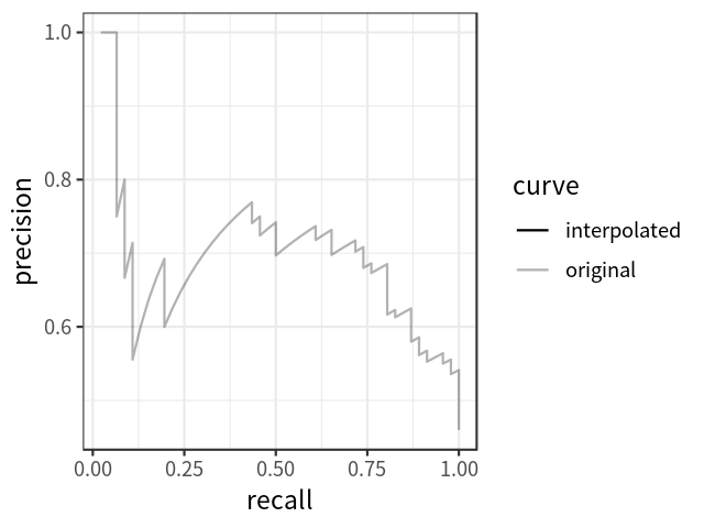 Note that there are two ways to choose the levels of recall (denoted as \(r\) above) at which the precision should be interpolated. The traditional way is to choose 11 equally spaced recall levels (i.e., 0.0, 0.1, 0.2, … 1.0); while a new standard adopted by the PASCAL VOC challenge chooses all unique recall levels presented by the data. The new standard is said to be more capable of improving precision and measuring differences between methods with low AP. Figure 3 shows how the interpolated precision-recall curve is obtained over the original curve, using the new standard.