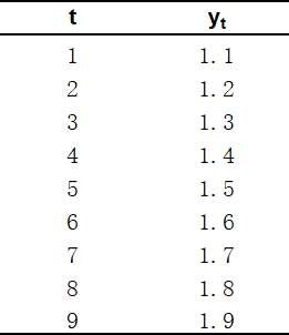 图 1 显示的是一条含有\(N = 9\)个观测值的时间序列;其中,\(t\)代表观测的时间点,\(y_t\)代表对应时间点的观测值。对该序列,我们将使用近3个时间点(\(d = 3\))的观测值,来计算未来4个时间点(\(H = 4\))的预测值,即\(\hat{y}_{10}, \hat{y}_{11}, \hat{y}_{12}, \hat{y}_{13}\)。