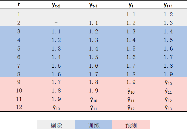 - 以\((y_{7}, y_{8}, y_{9})\)作为模型输入,得到\(\hat{y}_{10}\);