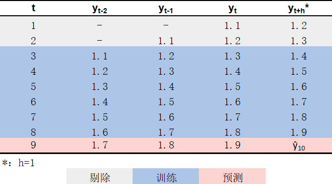 为了训练这样的模型,我们需要使用滑窗方法对原始时间序列进行处理,得到一个包含上述输入输出关系的数据集。以 图 1 中的时间序列为例,一个满足要求的数据集如 图 2 蓝色部分所示2。在得到该数据集之后,即可将\(y_{t+1}\)作为因变量、\((y_{t-2}, y_{t-1}, y_{t})\)作为自变量训练回归模型;其训练方法与一般回归模型的训练方法相同,此处不再赘述。
