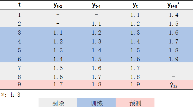 为了训练上述模型,我们需要使用滑窗方法对原始时间序列进行处理,分别得到\(H\)个包含对应输入输出关系的数据集。回到本文提出的例子,满足要求的\(H = 4\)个数据集分别如 图 3 、 图 4 、 图 5 和 图 6 蓝色部分所示4。在得到这些数据集之后,即可将\(y_{t+h}\)作为因变量、\((y_{t-2}, y_{t-1}, y_{t})\)作为自变量,使用各数据集分别训练1个回归模型\(\hat{f}_{h}\);具体而言: